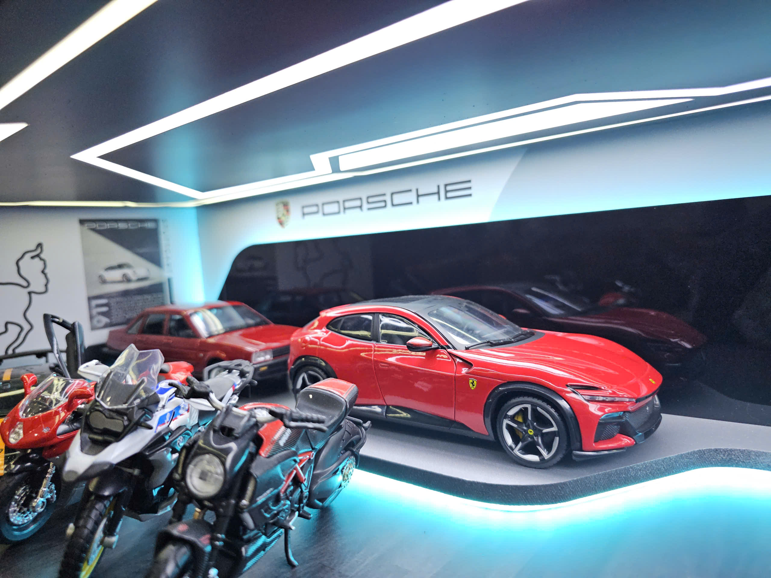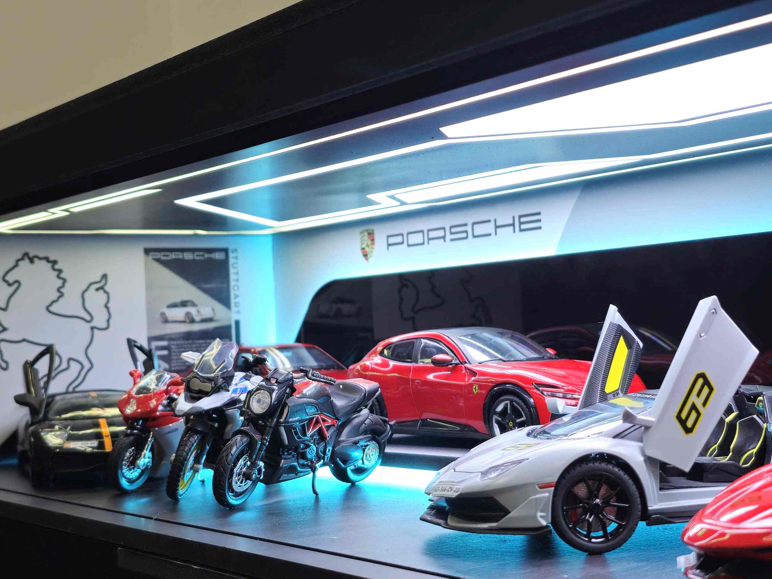 This product is a complete display diorama, blending a modern showroom aesthetic with a personal garage atmosphere, allowing sports cars, hypercars, and performance motorcycles to coexist in one cohesive space.