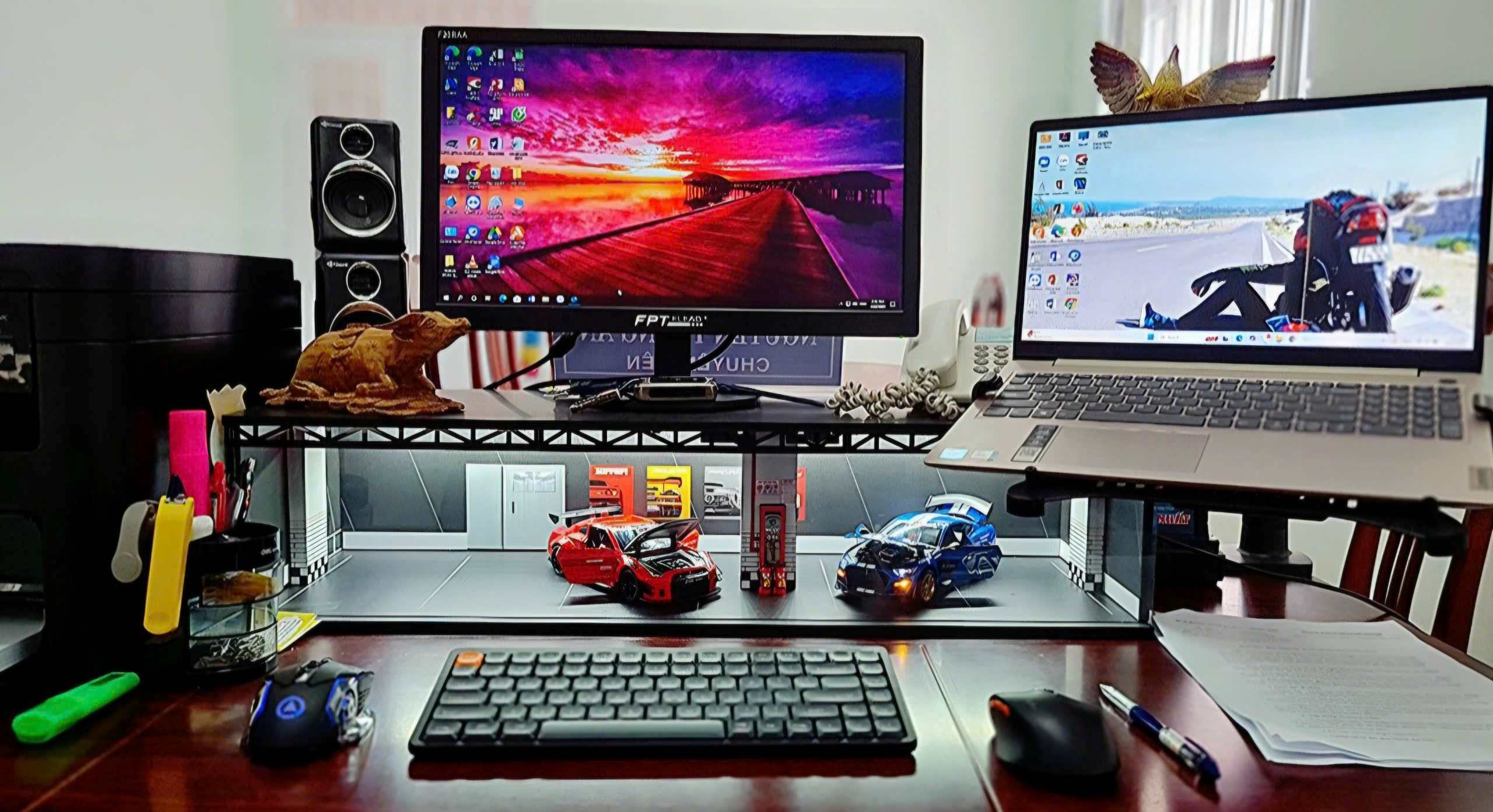 By combining modern work tools with supercar models, the diorama creates: