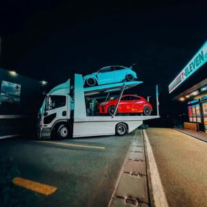 một điểm dừng chân ban đêm, xe vừa tấp vào, ánh đèn phản chiếu lên thân xe, không gian yên tĩnh nhưng không trống trải.