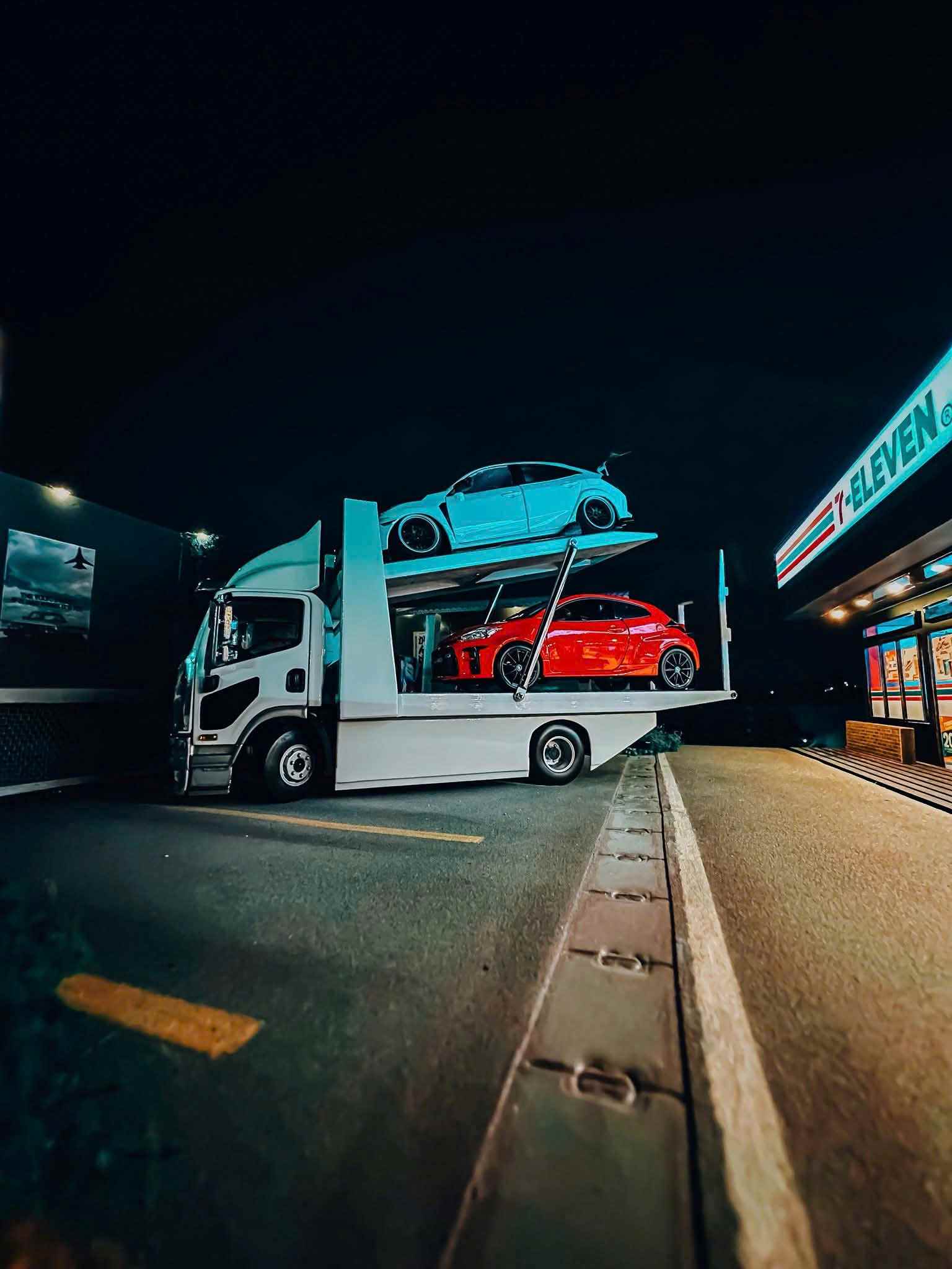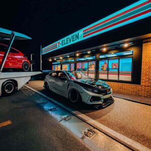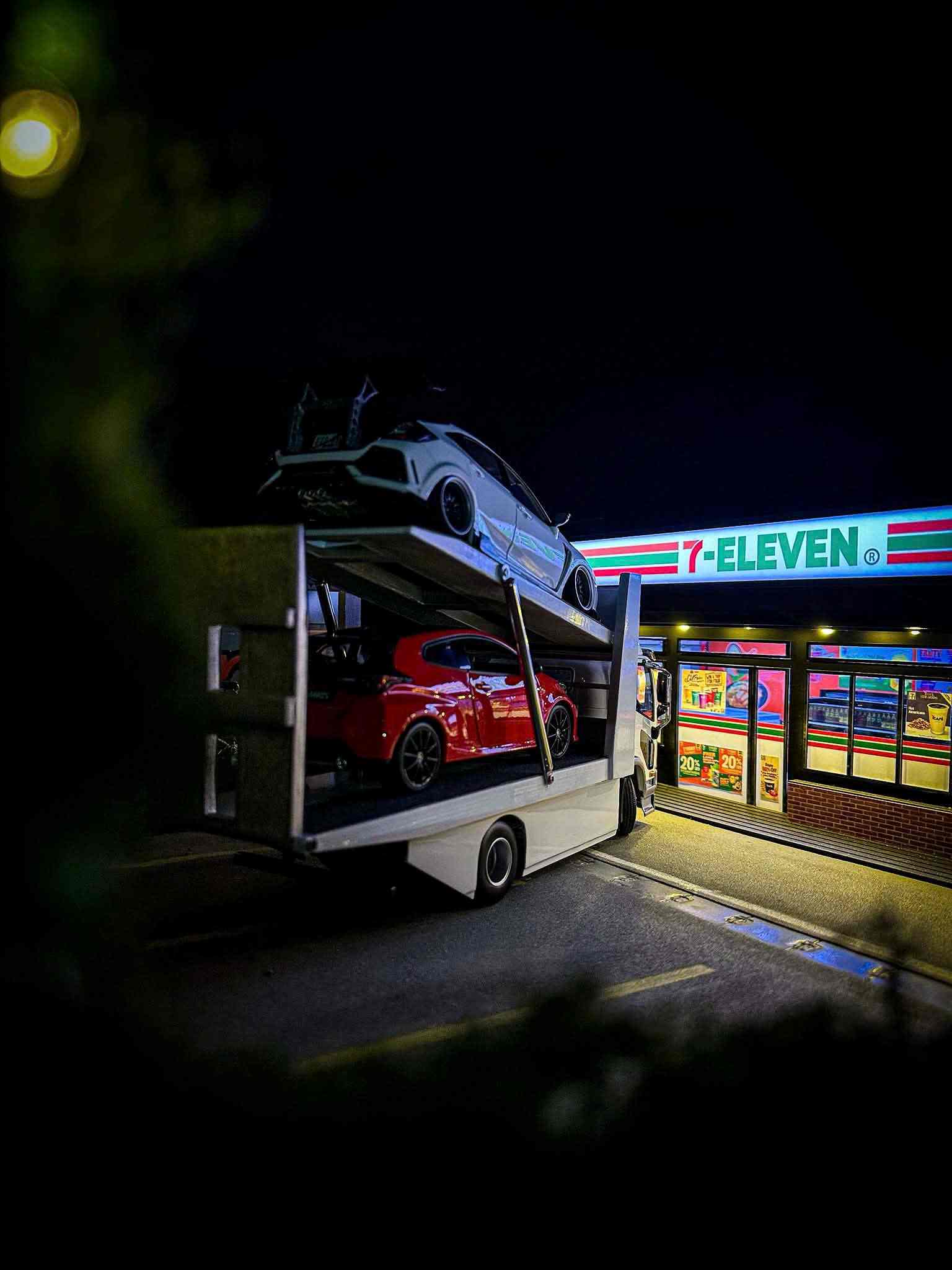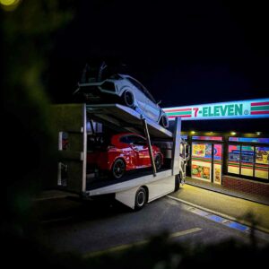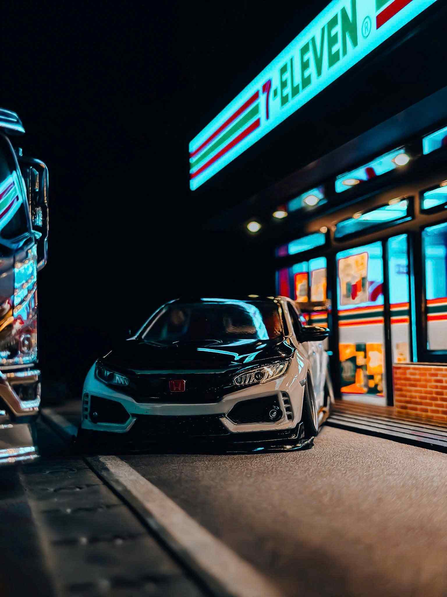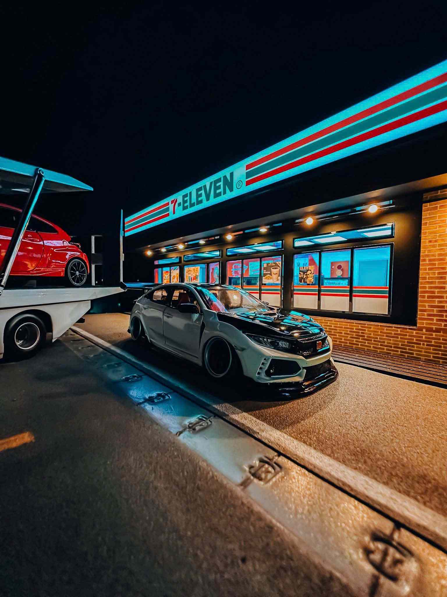 Không gian đêm được xử lý ánh sáng nổi bật với bảng hiệu 7-Eleven, hệ thống đèn cửa hàng, mặt đường và vạch kẻ giao thông rõ nét. Các chi tiết xe hơi, xe máy và bố cục bãi đỗ được sắp xếp tự nhiên, tạo cảm giác như một khoảnh khắc bắt gặp ngoài đời thực.