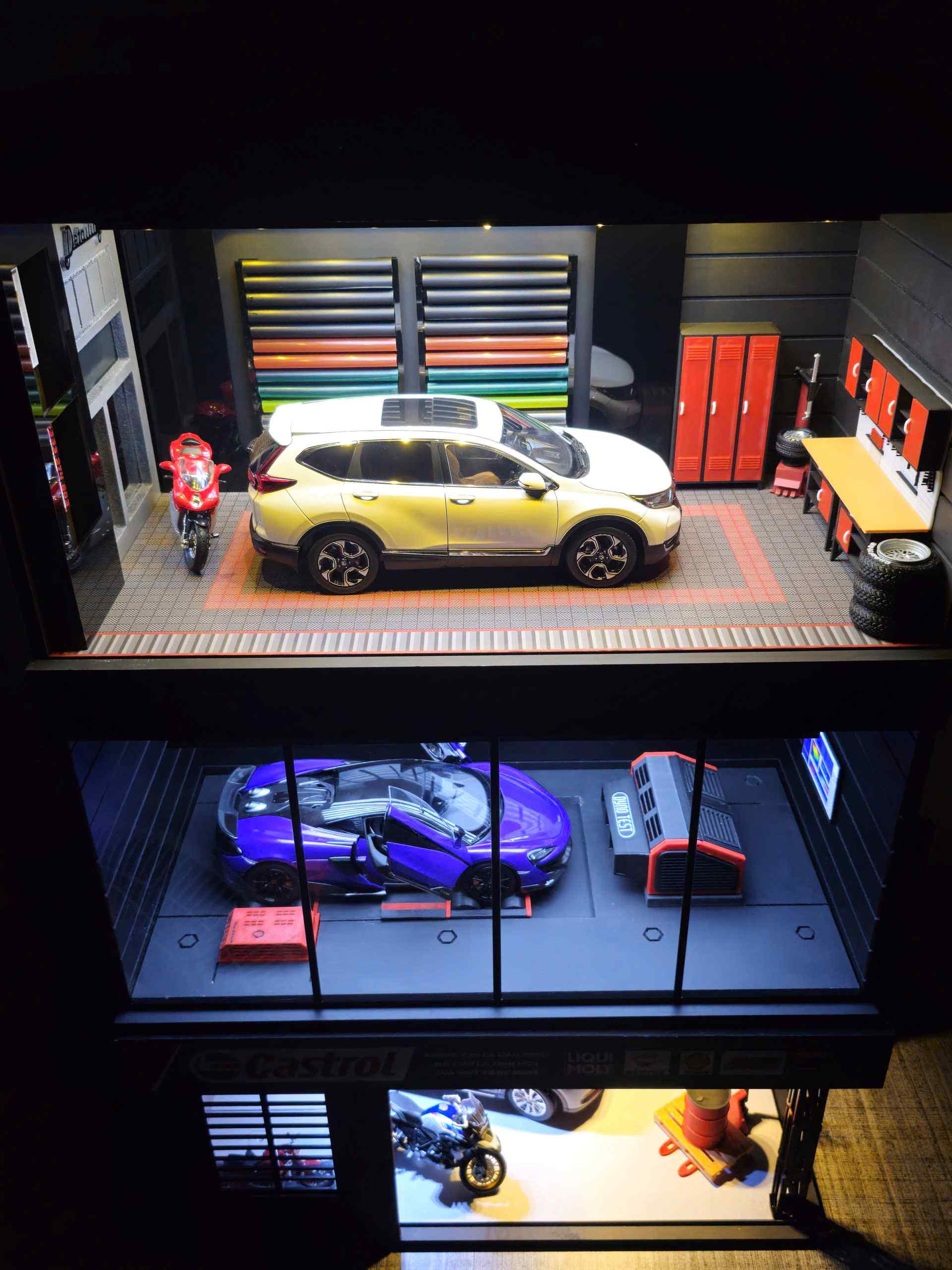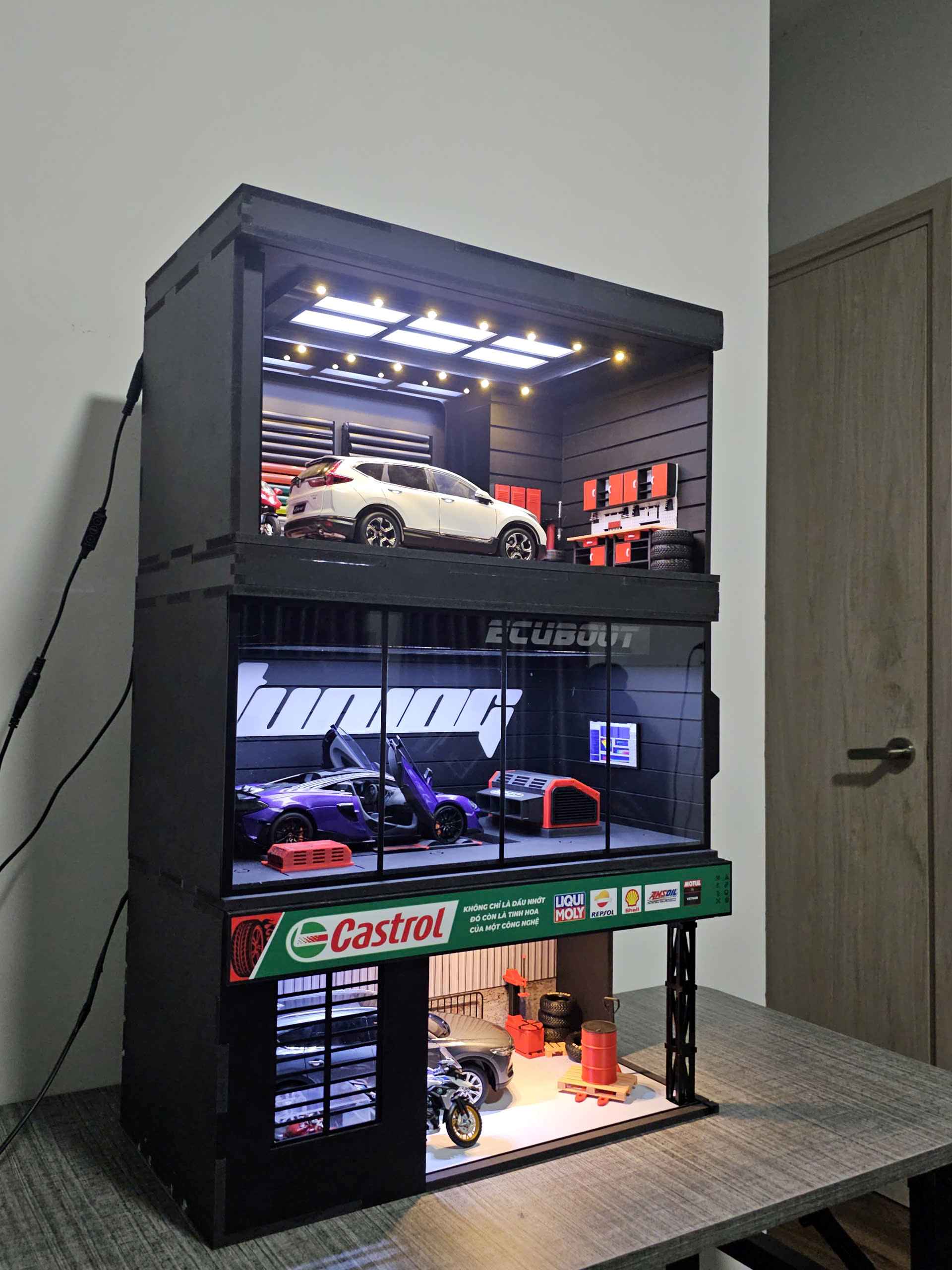 Diorama nhiều tầng tái hiện trọn vẹn thế giới của người yêu xe: trưng bày, bảo dưỡng và thưởng thức tốc độ trong cùng một khung cảnh.