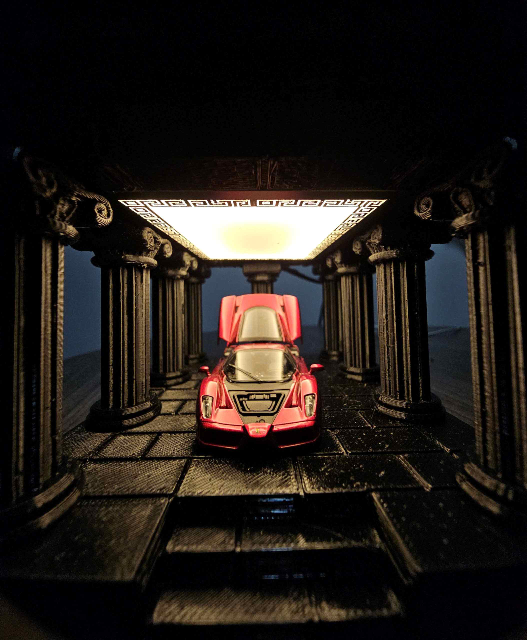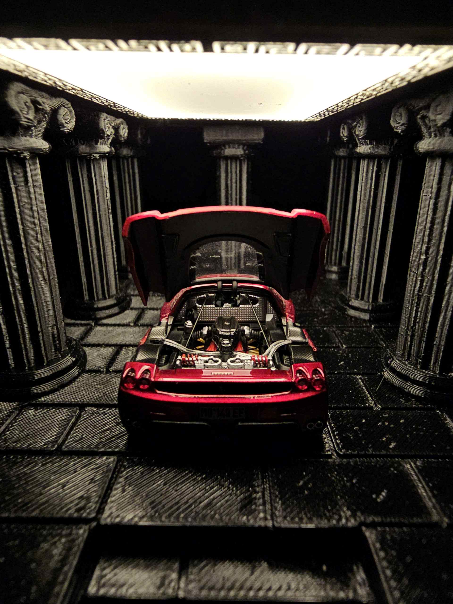 Không gian cột đá cổ được xử lý texture sâu, ánh sáng trần tập trung vào trung tâm, khiến chiếc xe trở thành điểm nhìn duy nhất ngay khi ánh mắt chạm vào. Việc mở khoang động cơ phía sau tạo thêm chiều sâu kỹ thuật, làm nổi bật tinh thần cơ khí – thứ mà người yêu xe luôn tìm kiếm.
